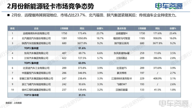 比亚迪自1月份首次进入轻卡市场TOP5榜单后,在2月继续发力。远程商用车稳坐销冠,北汽福田、陕汽集团紧跟其后,比亚迪位列第6,同比增长373.8% ,旗下比亚迪T5车型凭借出色的续航能力和载货性能,赢得了不少物流企业的认可,这不仅体现了比亚迪在新能源物流车领域的技术实力和市场竞争力,也意味着其正逐步改变轻卡市场的竞争格局,让整个市场的竞争更加白热化。传统油车企业同样在发力,不断加大在新能源领域的投入,试图在这个快速增长的市场中分得一杯羹。