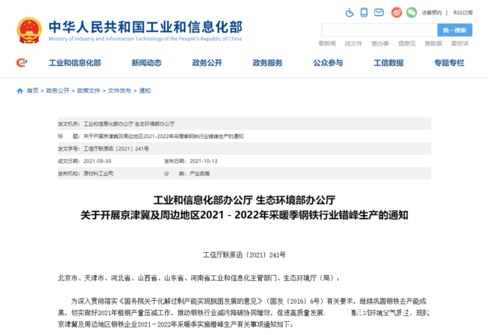 10月13日,工业和信息化部办公厅和生态环境部办公厅联合发布了《关于开展京津冀及周边地区2021-2022年采暖季钢铁行业错峰生产的通知》。