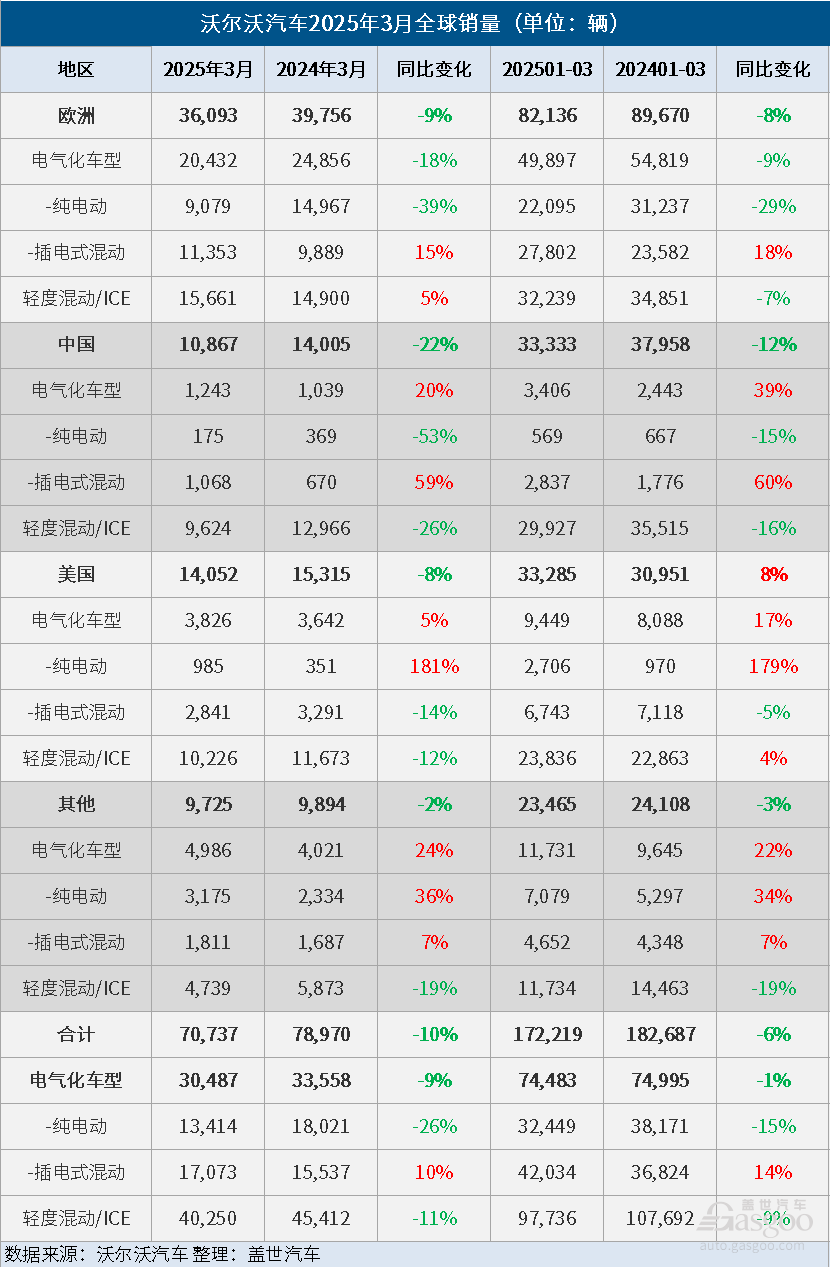 就地区来看,今年3月份,在欧洲市场,沃尔沃汽车的销量同比下降9%至36,093辆,其中,电气化车型的销量同比下降18%至20,432辆,占沃尔沃汽车当月欧洲总销量的57%。