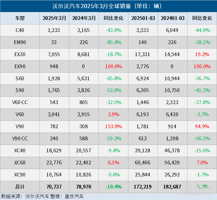 驾车游乐讯 4月2日,沃尔沃汽车公布,今年3月份,其全球销量同比下降10%至70,737辆,主要原因是纯电动车型销量大幅下滑;今年第一季度,沃尔沃汽车的全球销量同比下降6%至172,219辆。