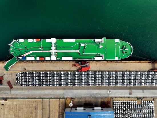 2023年3月25日,江苏连云港一处码头,远洋滚装轮装载出口汽车。图/视觉中国