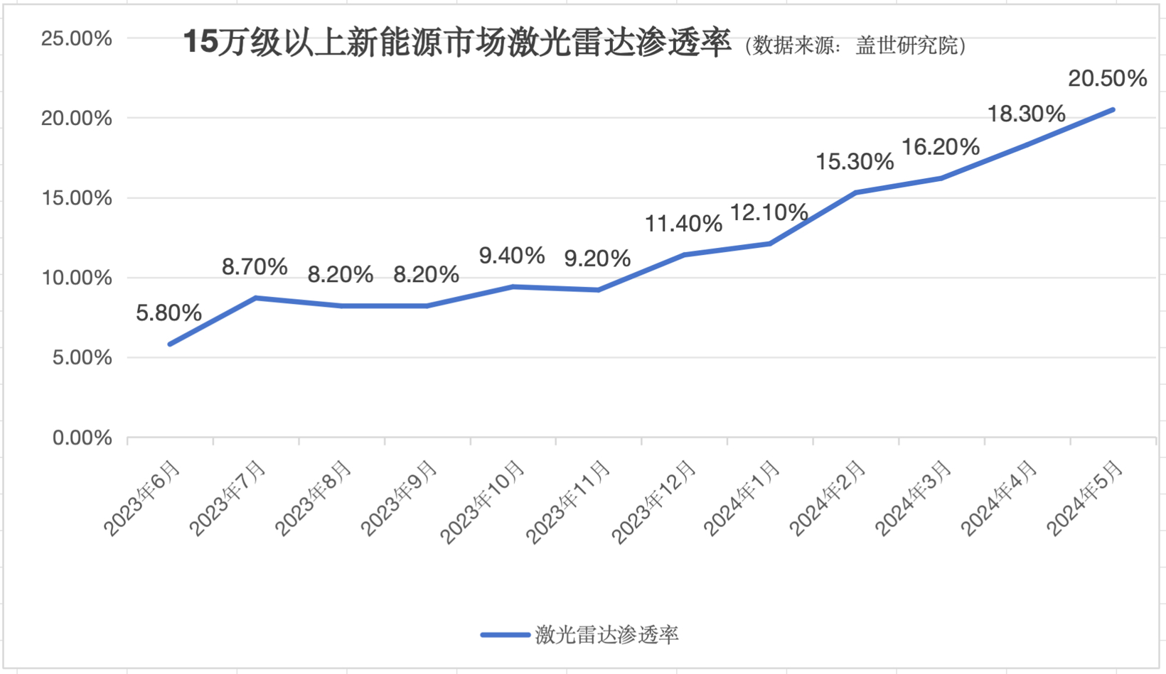 据驾车游乐研究院数据,2024 年中国市场激光雷达装机量大幅增长 211.9%。今年 5 月,15 万元以上新能源汽车销量约 50.9 万台,激光雷达渗透率达 20.5%,已经提前实现了“跨越鸿沟”。更为值得一提的是,5月在销量排名前 10 的头部“新势力”(包含传统车企新品牌)品牌车型中,激光雷达平均搭载率已经超过60%,而且这一速度仍在加快。