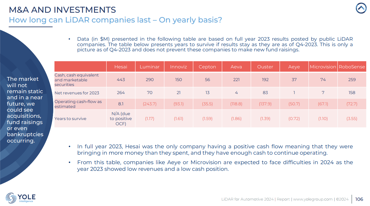 《Yole报告》将禾赛、Luminar、Innoviz、Ouster等激光雷达企业的现金储备、年度营收、以及经营现金流等进行对比后发现,从现在算起,绝大多数激光雷达企业活不过两年,而禾赛的财务状态是一众激光雷达厂商里最好的,已经能够实现正向“造血”。