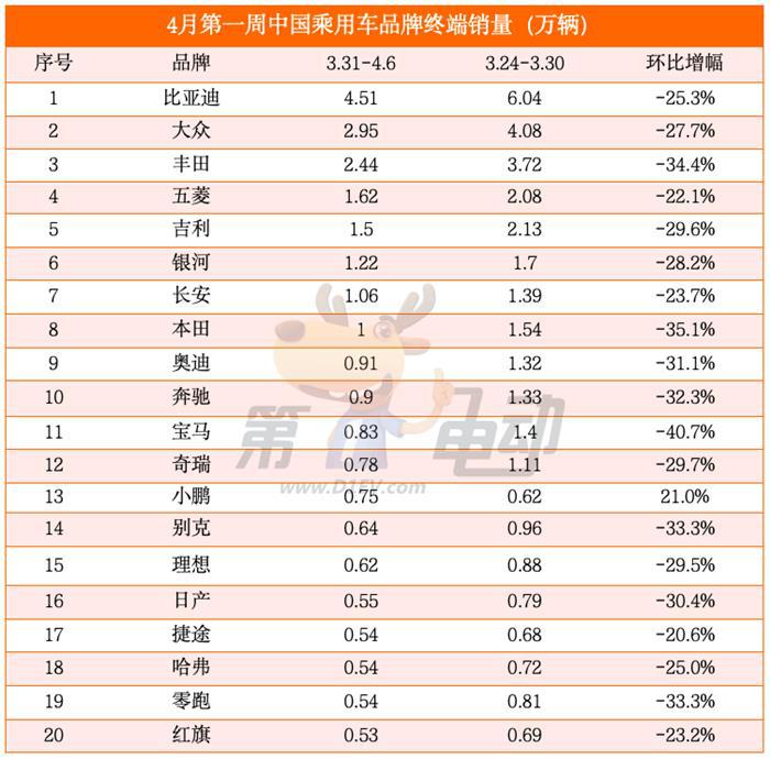 受清明假期影响,4月首周(3.31-4.6)中国乘用车终端总量达33.7万辆,环比大降43.11%。