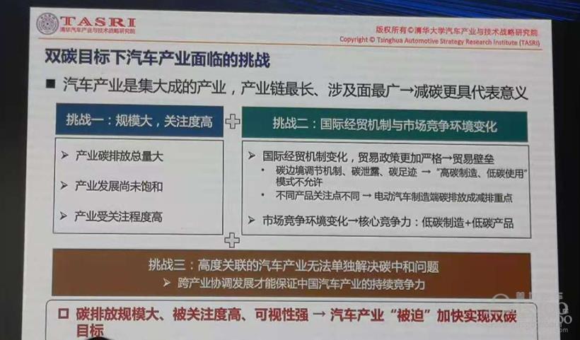 他进一步分析指出,从产业内部而言,汽车要解决全产业链全生命周期的问题,不仅是制造、生产、物流的问题,从最初的产品制造到最后的保费,所有的供应链都要减碳。从产业外部来看,者要实现跨行业、跨领域间的协同脱碳。上游能源要支撑汽车产业全生命周期中零碳能源应用,交通环境要提供汽车产业低碳、零碳产品应用场景。此外,还要建立健全以碳配额、碳交易为核心的低碳政策法规体系,保障汽车产业低碳转型。