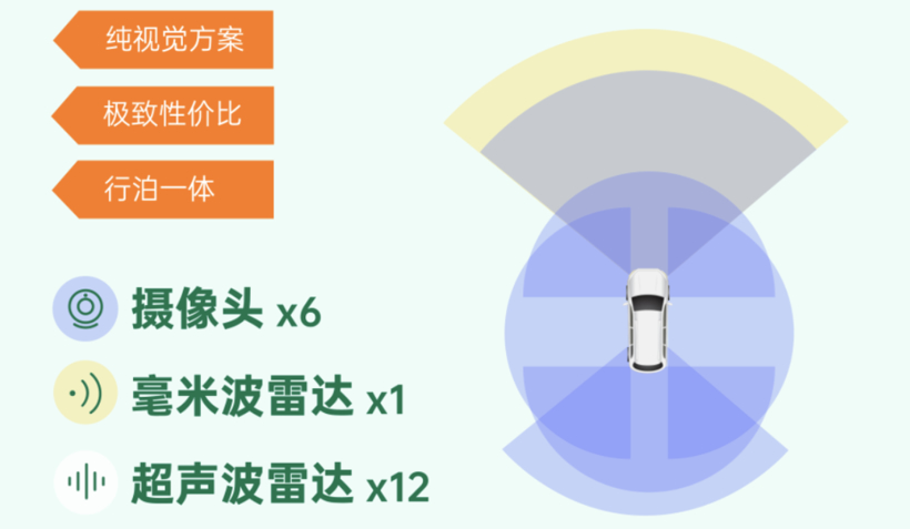 6V1R的重点在于视觉感知算法,把鱼眼摄像头也纳入到行车的感知结果中,做到传感器和计算芯片都能复用的行泊一体,同时通过正后方的摄像头实现对后方中远距目标的感知,用最优的成本实现无盲区的360°感知。