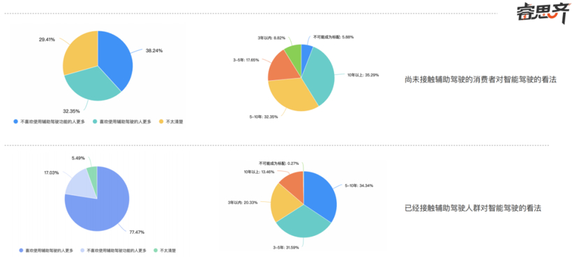 专业智能汽车咨询机构“睿思齐”曾做过一次调研,结果显示亲自体验过智能驾驶的消费者,认为“自己身边喜欢使用辅助驾驶的人”占比要远高于尚未接触过智能驾驶的消费者,对智驾功能的发展趋势也更为乐观。