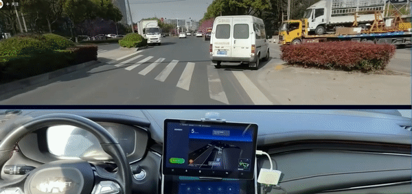 特别是绕行场景,轻舟智航的这套城市NOA方案绕行非常果断,即便是跟车时,前车突然减速停车,系统也能及时地提前找机会变道,避免跟着前车停车后再缓慢向相邻车道挪动带来安全风险。
