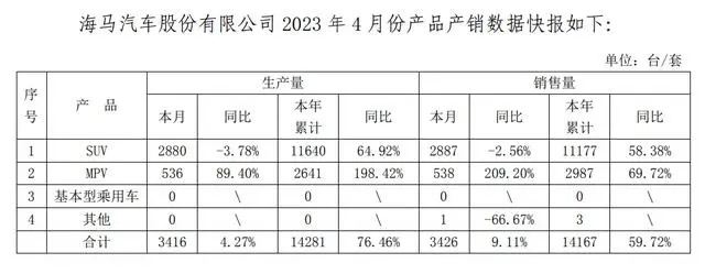 5月8日,海马汽车发布了2023 年4月份产销数据快报,4月汽车销量 3426 辆,同比增长 9.11%;1-4月累计销量14167辆,同比增长 59.72%。
