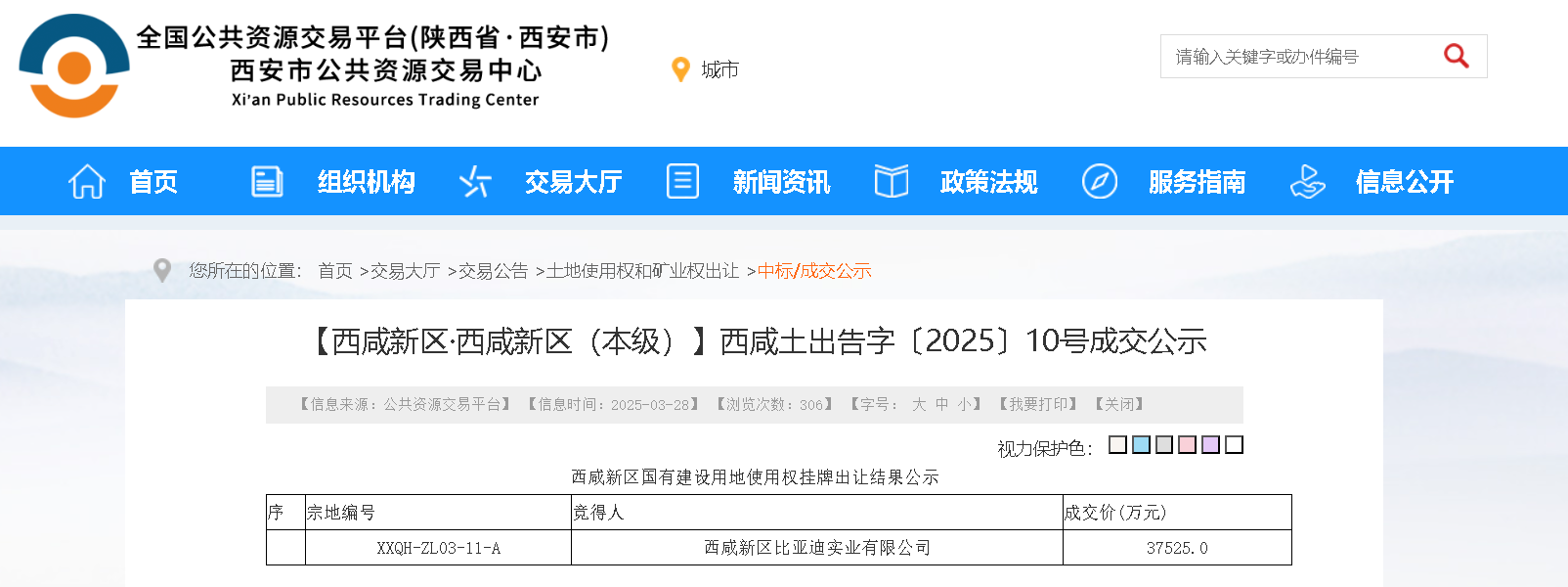 4月2日消息,据西安市公共资源交易中心官网消息,比亚迪于3月28日以3.75亿元竞得西安秦汉新城一处约1210.46亩国有建设用地使用权,该地块包含原宝能汽车西安基地部分用地。