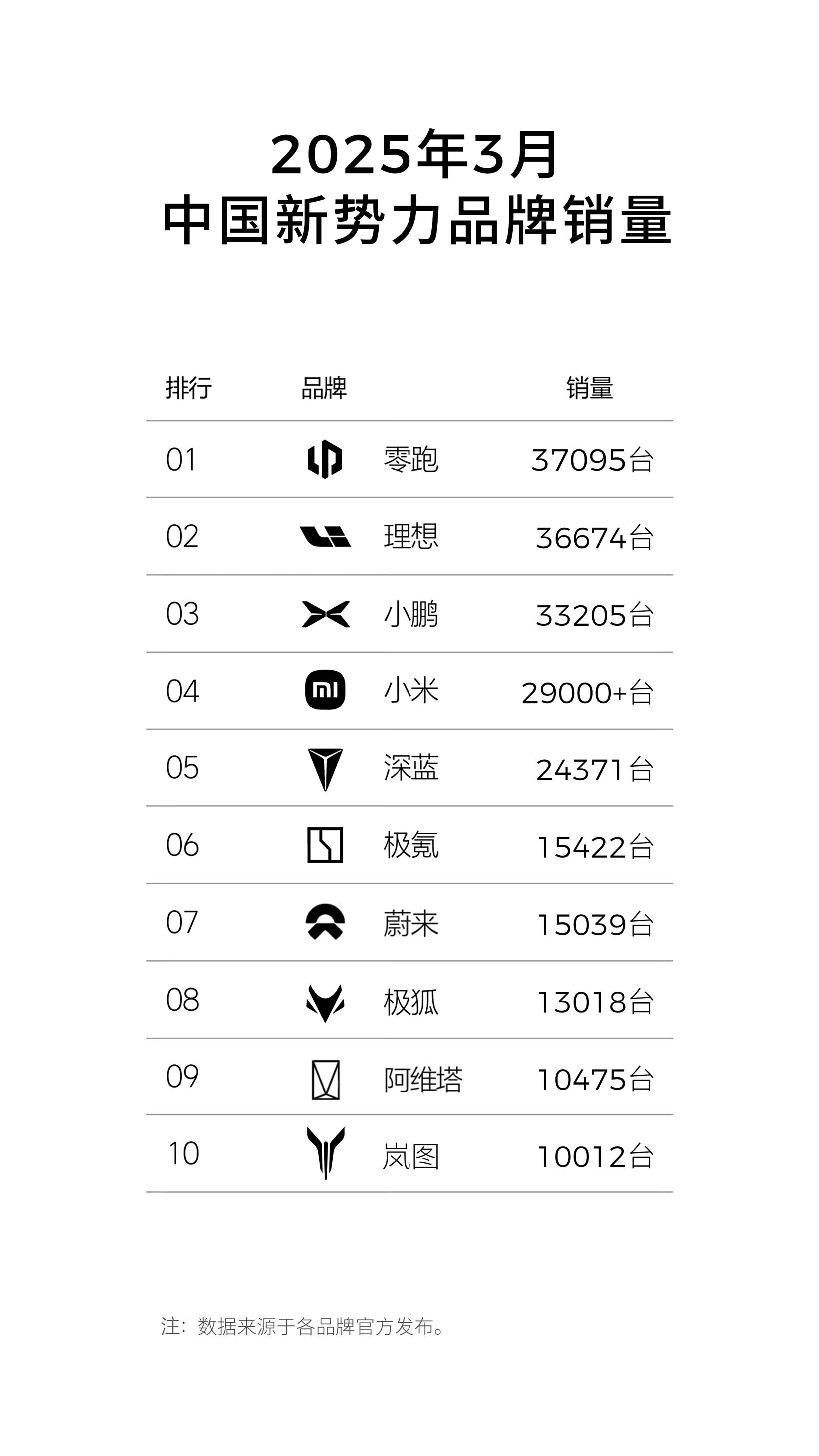 4月第一天,新能源车企们就开始按耐不住的秀出最新销量战报。整体来看,在经历了1、2月的短暂低谷后,3月多数车企销量实现环比上涨,且新势力的排名再度出现变化,其中零跑汽车以37,095辆的销量首次实现“领跑”,小鹏汽车则拿下一季度销冠。