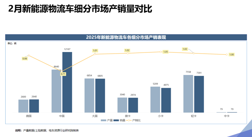 2025年2月,新能源物流车市场产销情况呈现出复杂态势。从月度产销比来看,整体处于下降趋势:1月为1.21,2月降至0.91。细分市场产销比也有一定差异:微面0.98,中面0.71,大面1.0,微卡1.02,小卡1.04,轻卡1.02,中卡1.0,各细分市场表现差异明显。