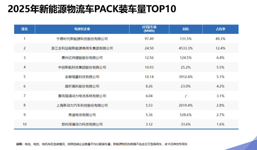 电芯与PACK企业排名2025年2月新能源物流车电池装车量TOP10电芯企业中,宁德时代以100.62MWh的装车量、50.9%的占有率遥遥领先,同比增长126.4%。中创新航、亿纬锂能分别位列第二、第三,占有率分别为12.6%、11.6%,同比增长显著,反映出行业整体的快速发展趋势。PACK装车量TOP10企业中,宁德时代同样居首,占有率49.3%。值得注意的是,浙江吉利远程新能源商用车集团有限公司凭借24.50MWh的装车量、4533.3%的同比增长跃居第二,占有率达12.4%,显示出吉利在新能源物流车电池包领域的快速崛起。