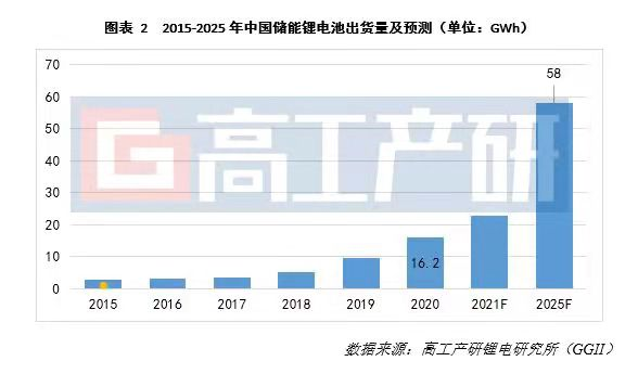 GGII预计,2025年全球储能电池出货量将达416GWh,未来5年年复合增长率约为72.8%;中国储能锂电池出货量将达58GWh,市场规模超过550亿元。其中,作为主要应用领域的电力储能锂电池“十四五”累计出货量将超60GWh。