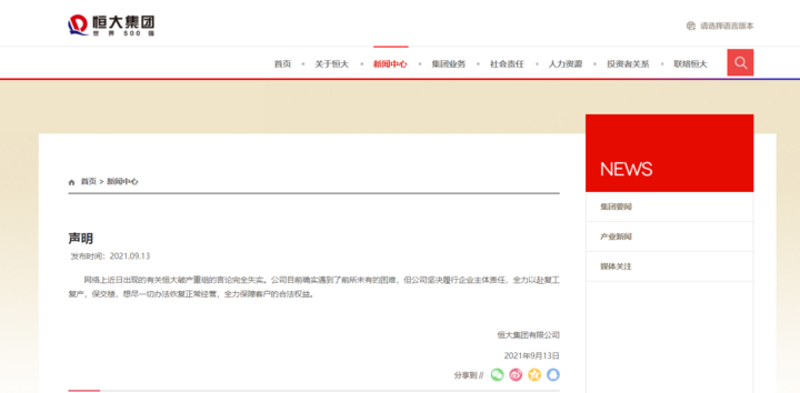 9 月 13 日晚间,恒大集团官网发布声明,网络上近日出现的有关恒大破产重组的言论完全失实。公司目前确实遇到了前所未有的困难,但公司坚决履行企业主体责任,全力以赴复工复产,保交楼,想尽一切办法恢复正常经营,全力保障客户的合法权益。